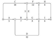 試験応援>2級土木H19>No.43〜 No.50 下図のネットワークに示す工事における最小の必要日数として,正しいものは次のうちどれか。 ただし,図中のイベント間のA〜Iは作業内容,また,数字は作業日数を表す。 @23日 A29日 B30日 C31日 解答例